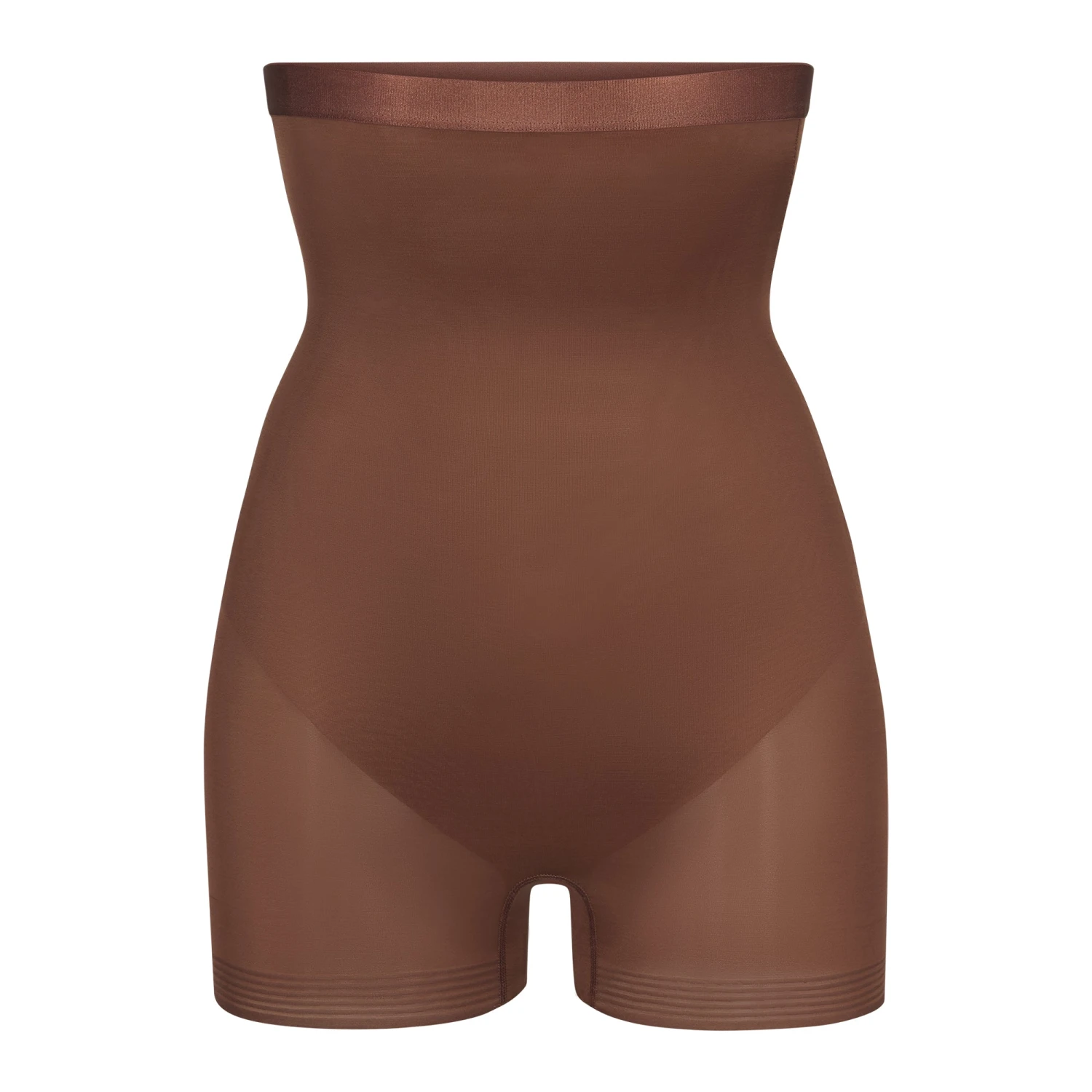 This high-waist short hits above mid-thigh to perfectly smooth your core, hips, and thighs. Features a comfortable elastic waistband, plus double-layered fabric at the mid-core for smoothing and compression. Wear with mini-length skirts and dresses for a seamless look.