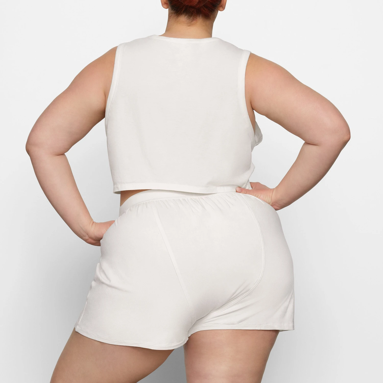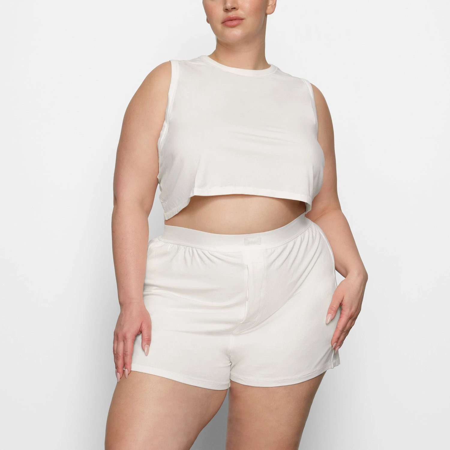 silhouette, now with an ultra-comfortable loose fit for top-tier lounging, sleep, and beyond. Features an elastic waistband with a front center SKIMS logo and button. Fits true to size.