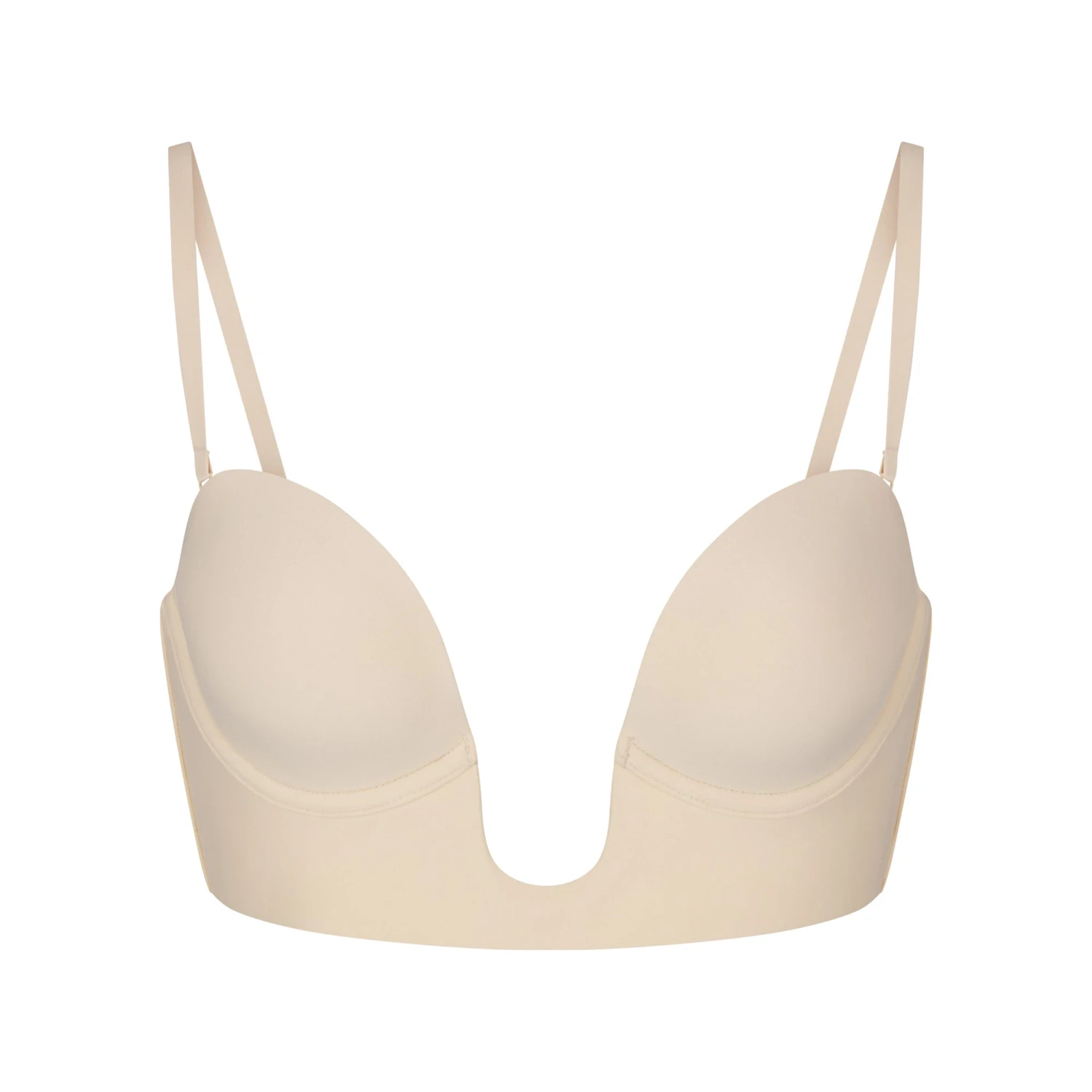 . Features a matte fabric, plunging U-wire details, molded lightly lined pads, adjustable straps that can be worn as strapless, halter, shoulder straps, or cross back, and a hook and eye closure. Fits true to size.
