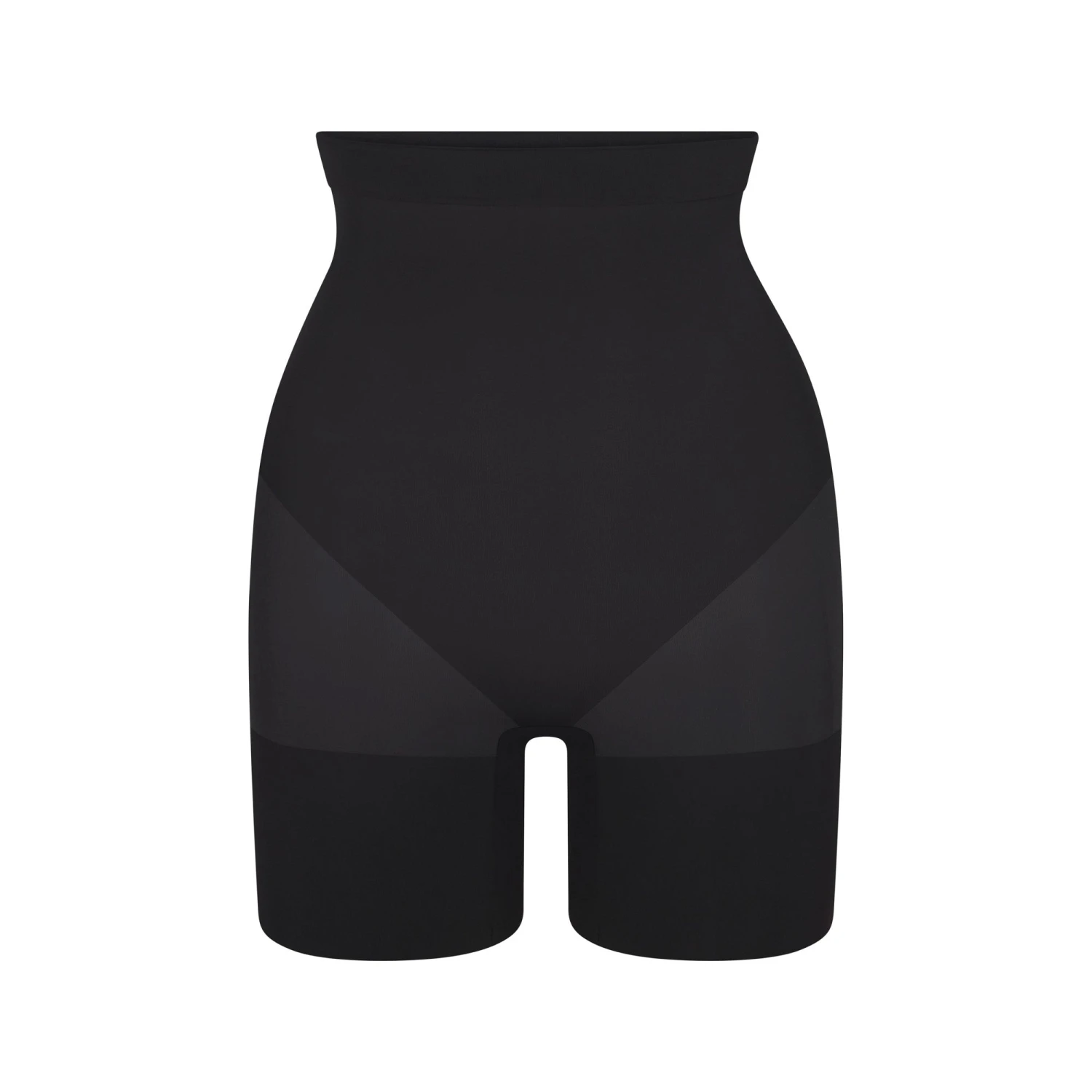 for comfortable all-day control of the tummy, waist, and thighs. Features an underband with interior silicone to prevent rolling, double-ply no-dig compression at the thighs, butt pockets that lift and define, and an open gusset. Fits true to size
