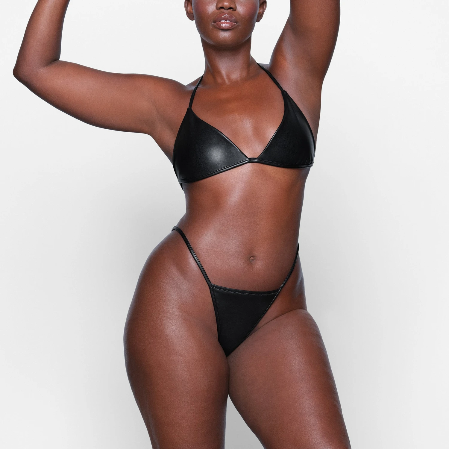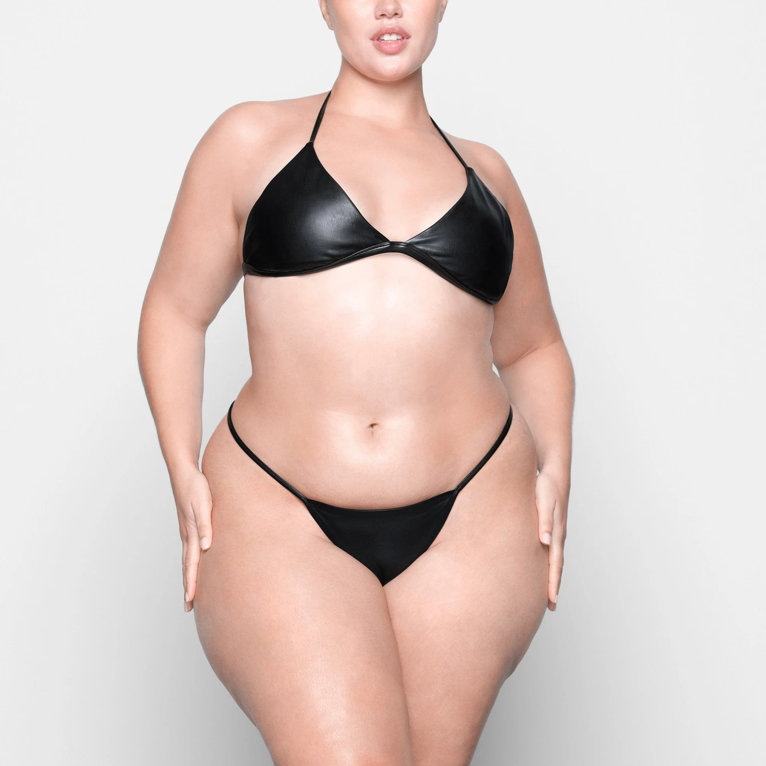 made to stand out. Pair with Faux Leather Triangle Bralette. Features 100% cotton gusset. Fits true to size.