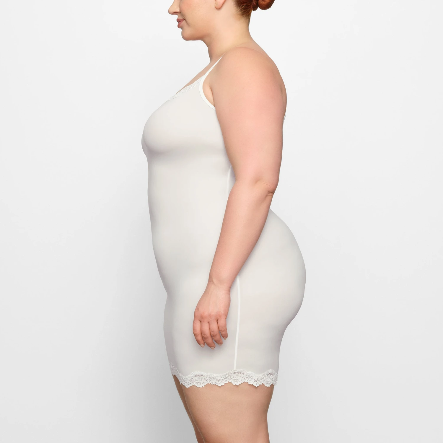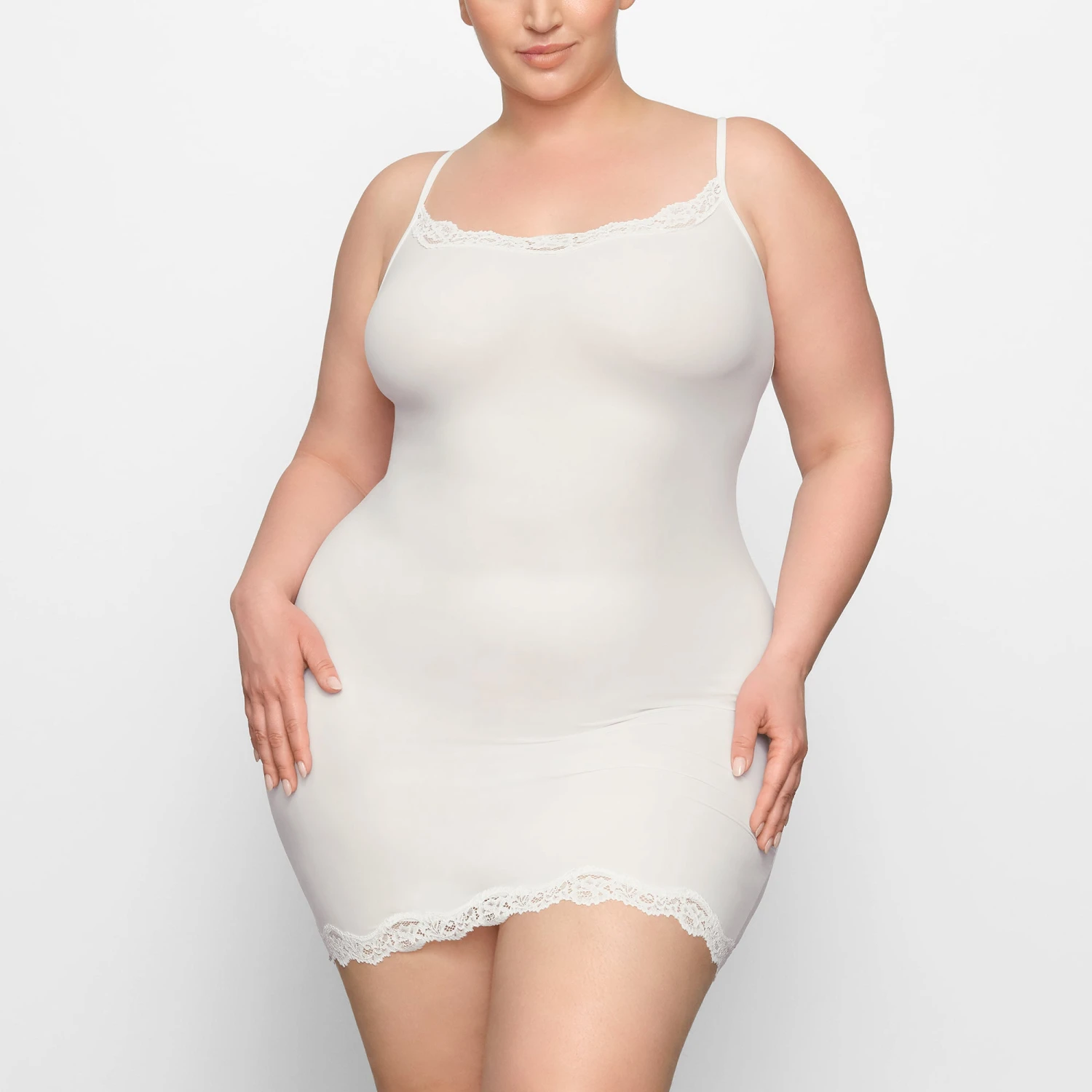 with romantic lace trims. Features a front scoop neckline and adjustable straps. Fits true to size.