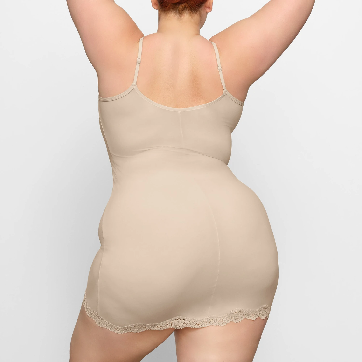 with romantic lace trims. Features a front scoop neckline and adjustable straps. Fits true to size.