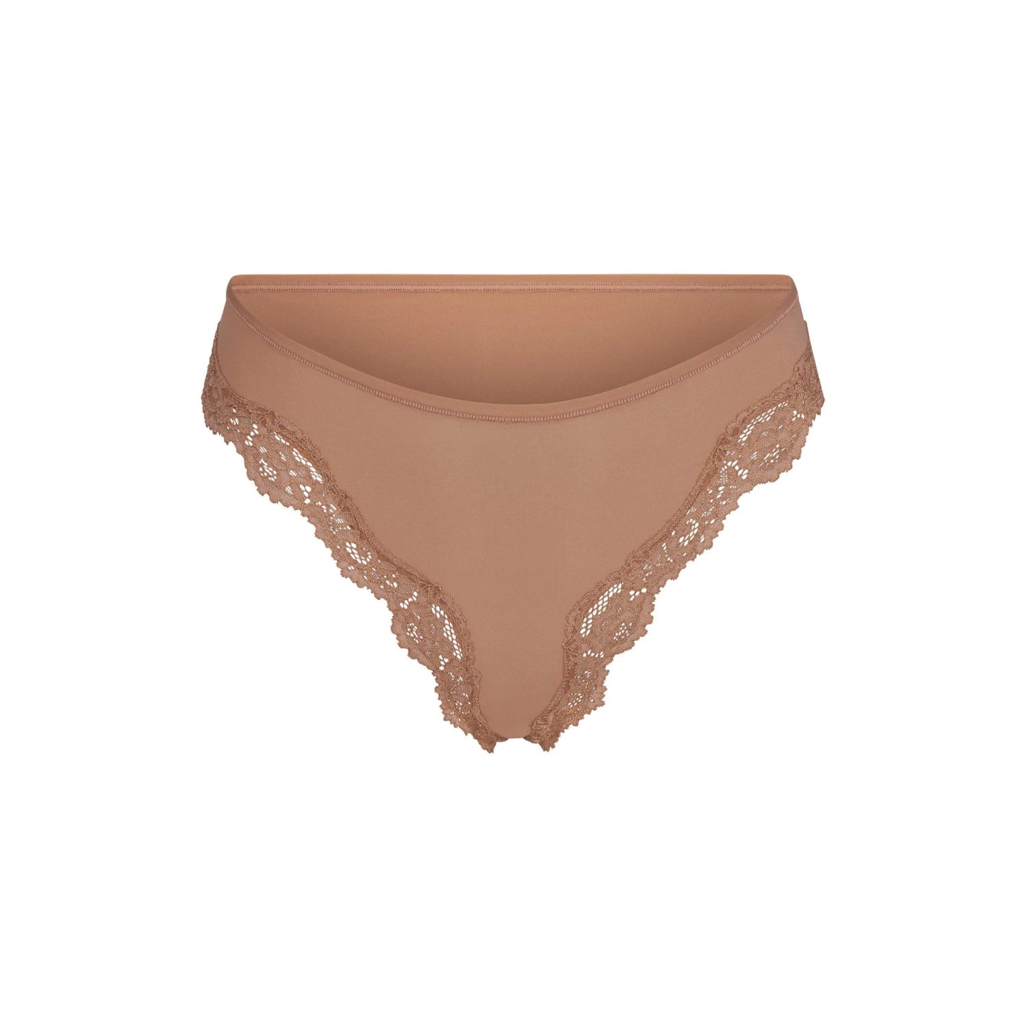 A cheeky, mid-rise tanga with ultra-luxe lace details. Features a 100% cotton gusset. Fits true to size.