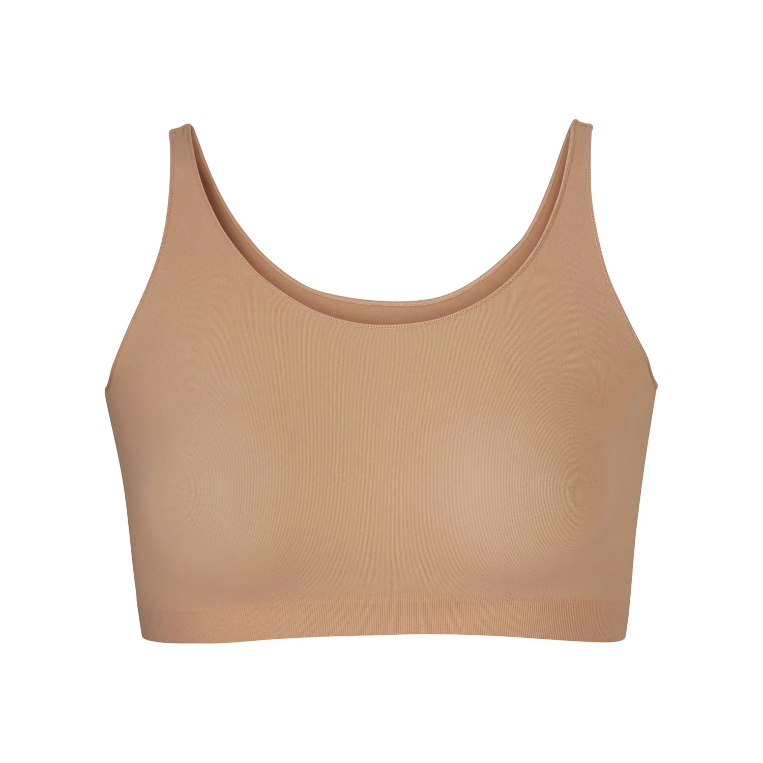 option, this sheer scoop neck bralette features seamless construction and a double layered under band for light support.