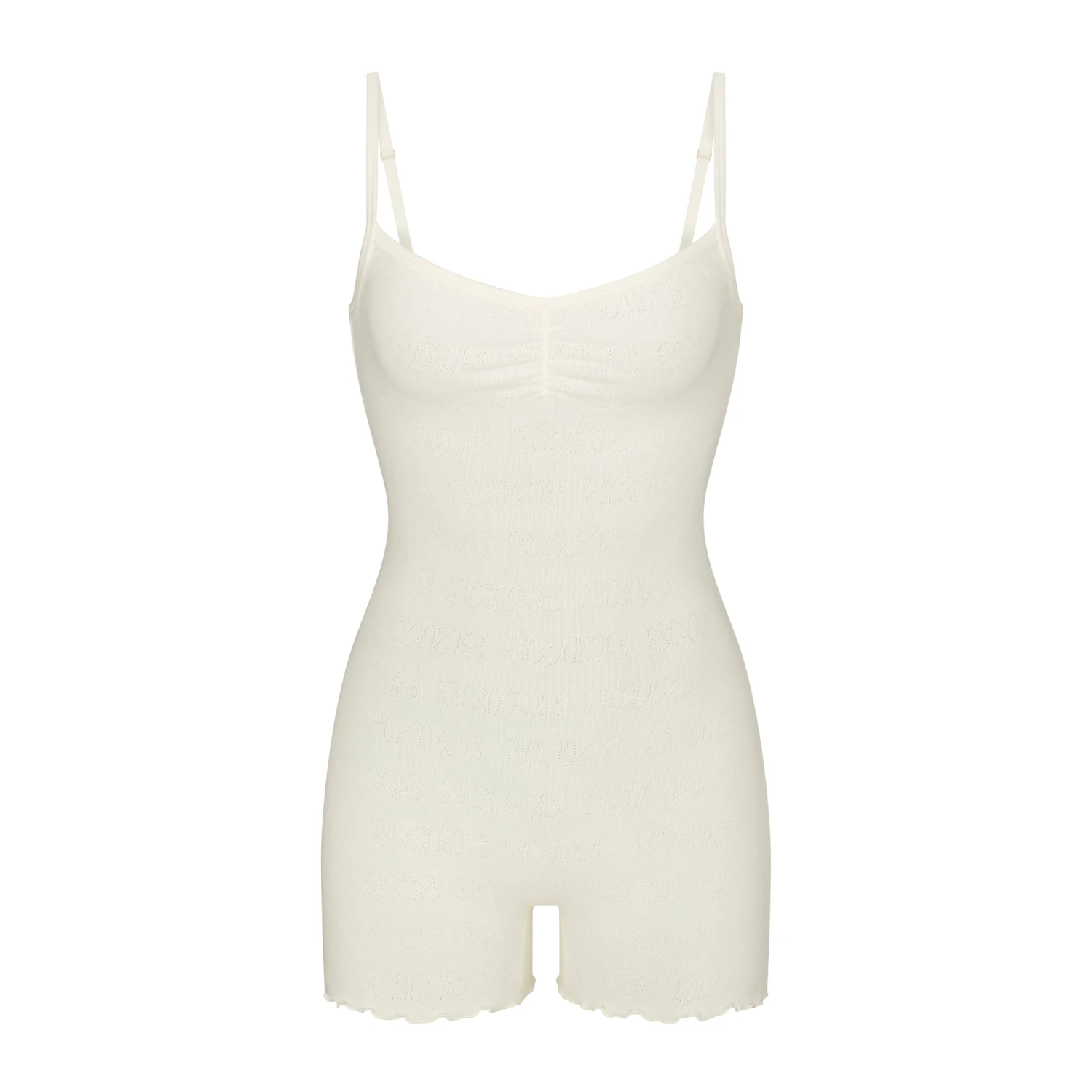 This one and done, logo-adorned lounge piece has flirty ruching details at the bust and a dreamy soft feel on the body. Features adjustable straps and ruffled edges at the leg opening. Fits true to size.