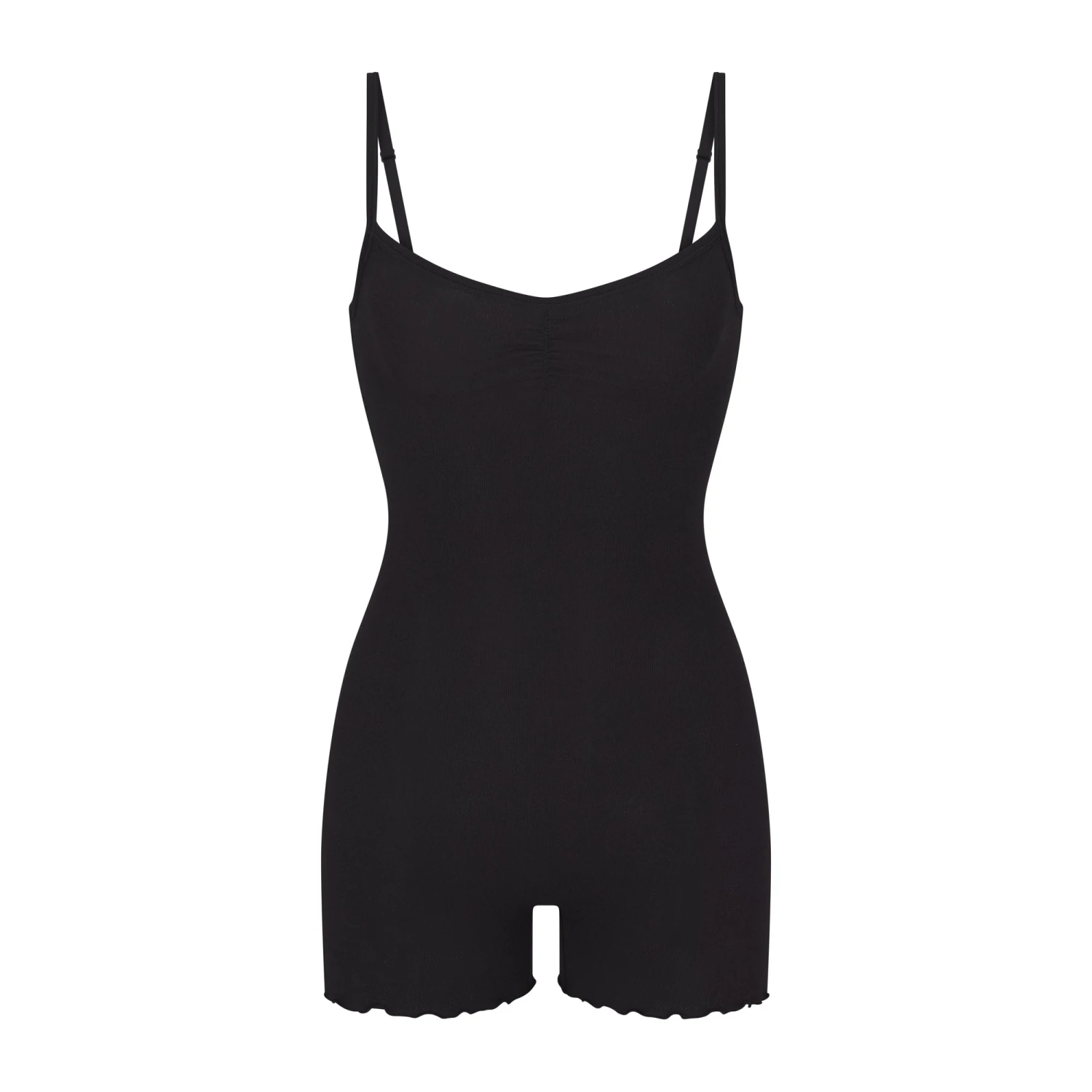 This one and done, logo-adorned lounge piece has flirty ruching details at the bust and a dreamy soft feel on the body. Features adjustable straps and ruffled edges at the leg opening. Fits true to size.
