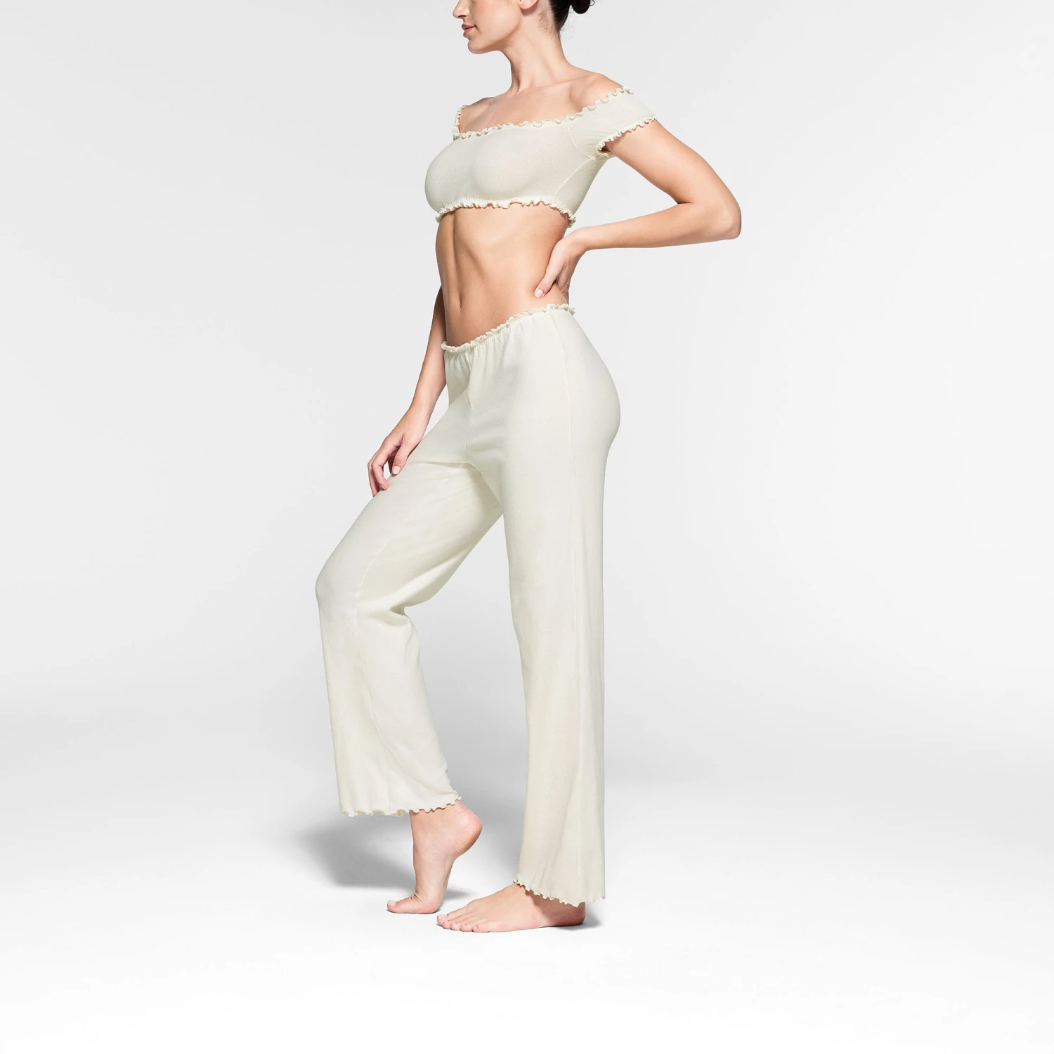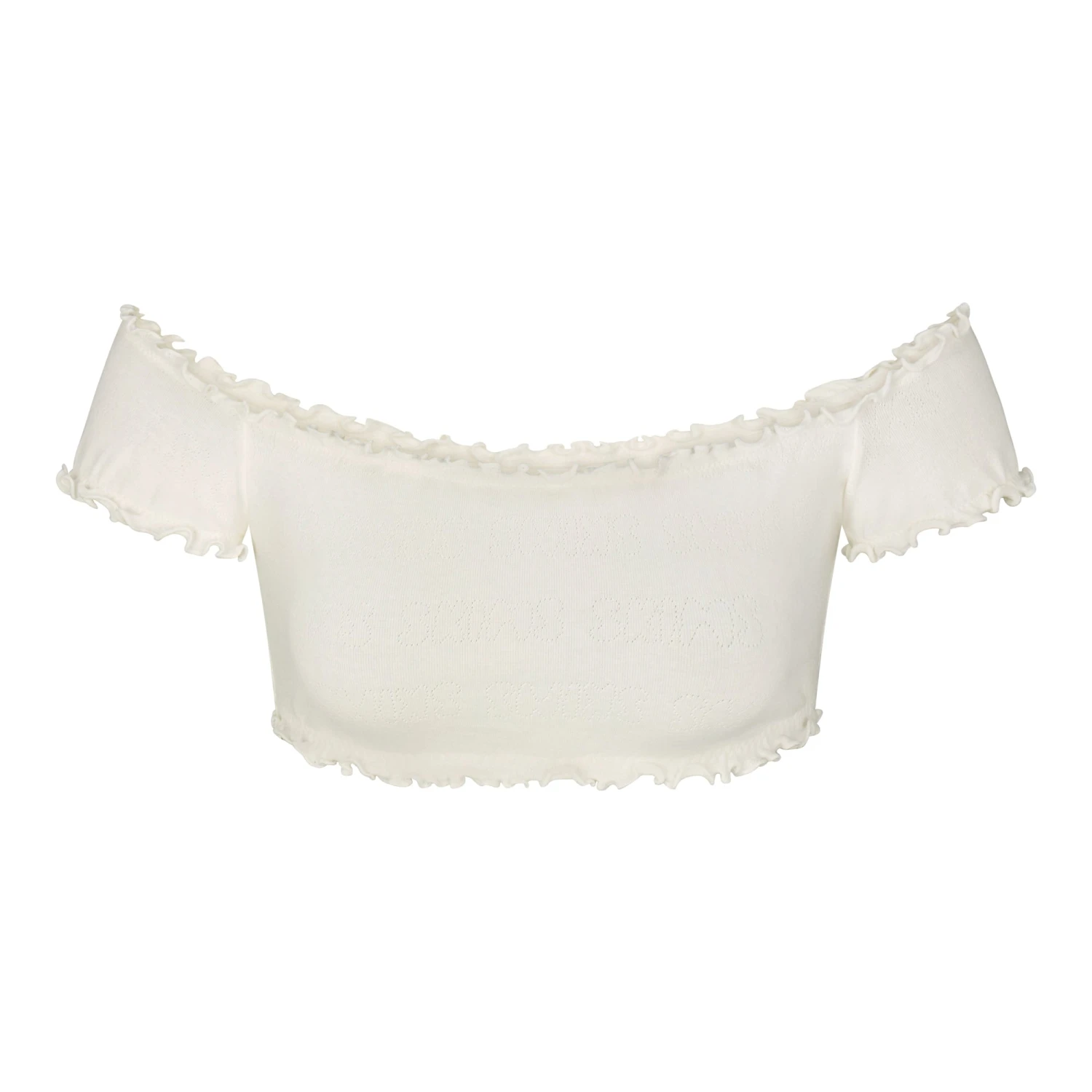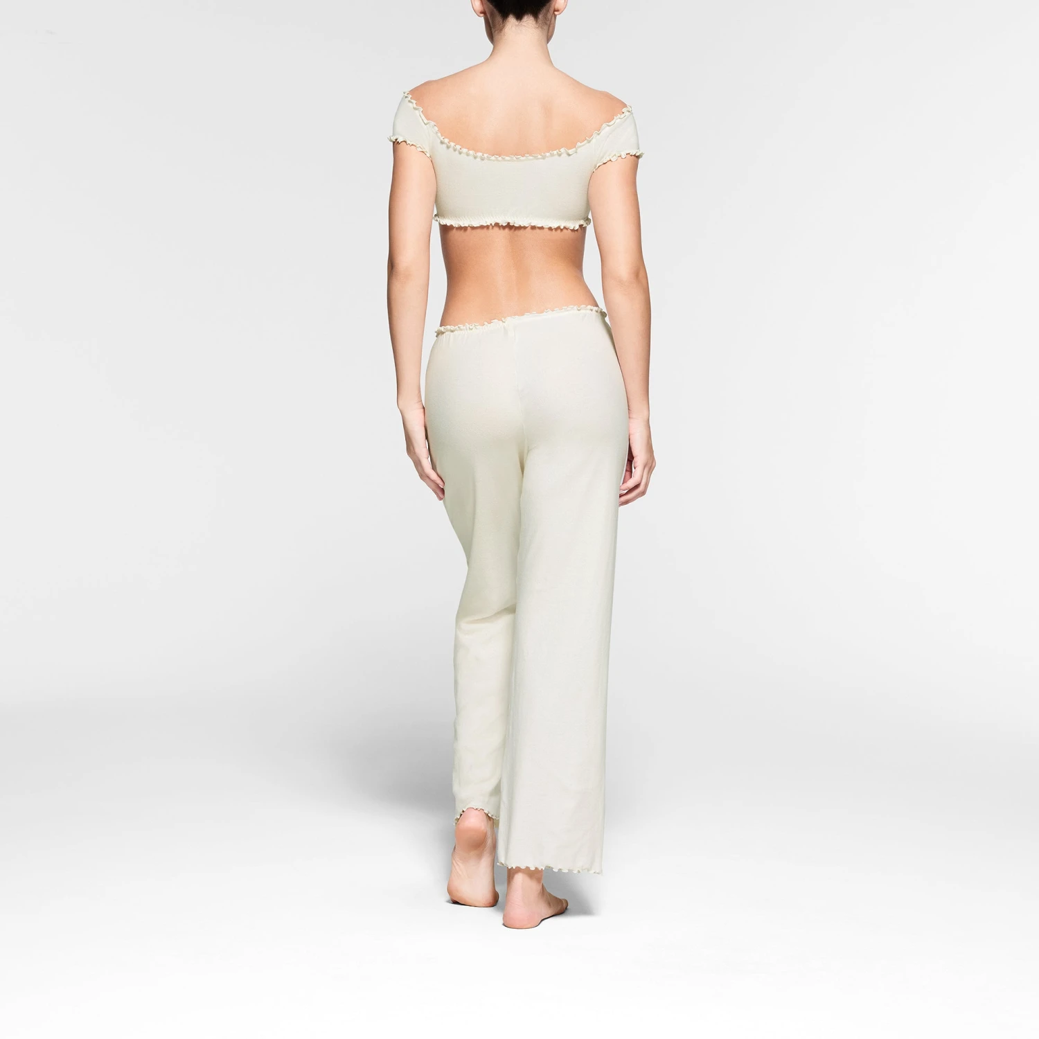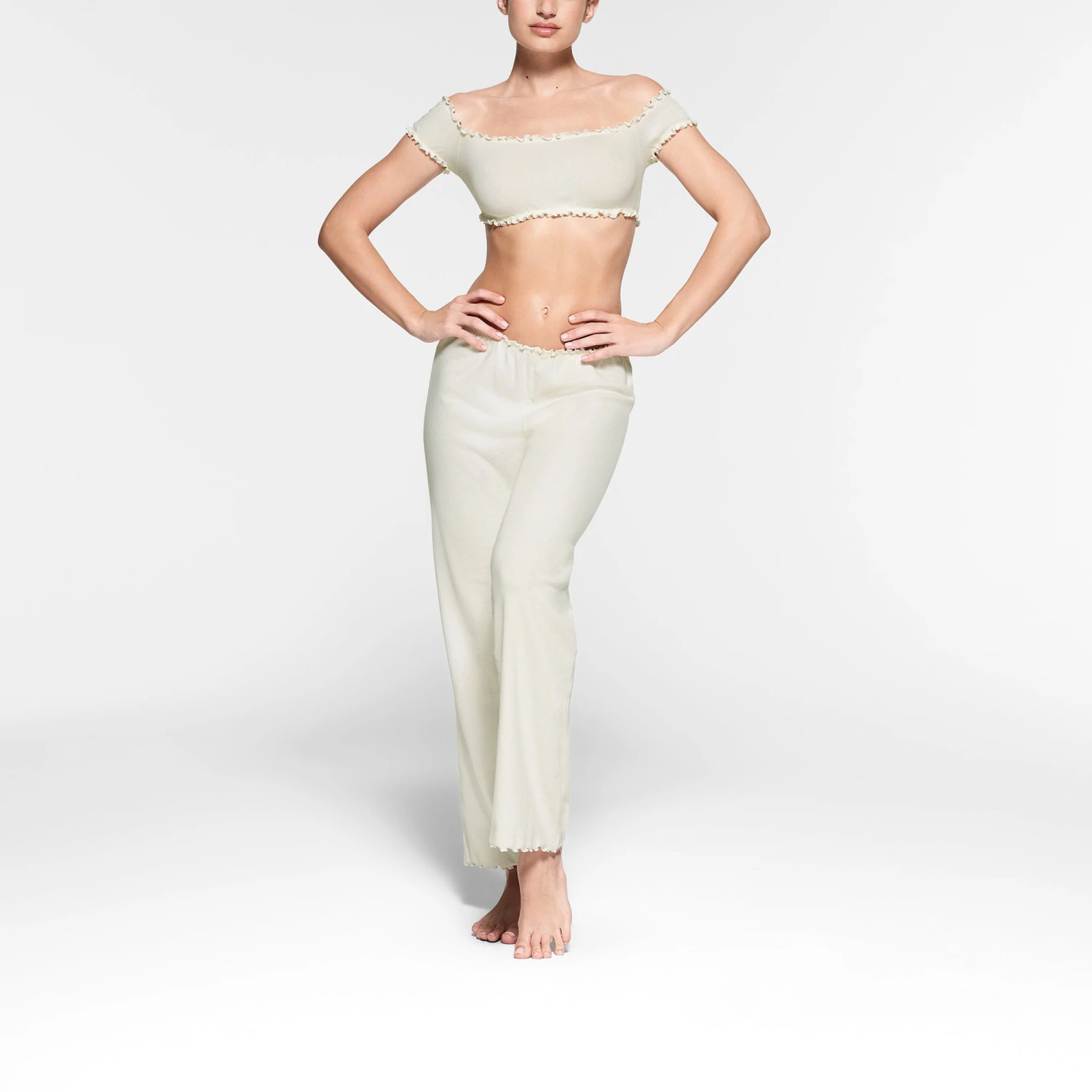 with flirty trims and adorned with all-over SKIMS logo details is essential for summer lounging. Hits right under the bust and features soft elastic at the underbust and arms to keep it in place. Wear it on or off the shoulder. Fits true to size.