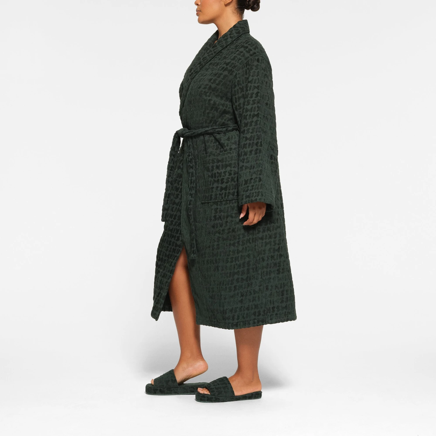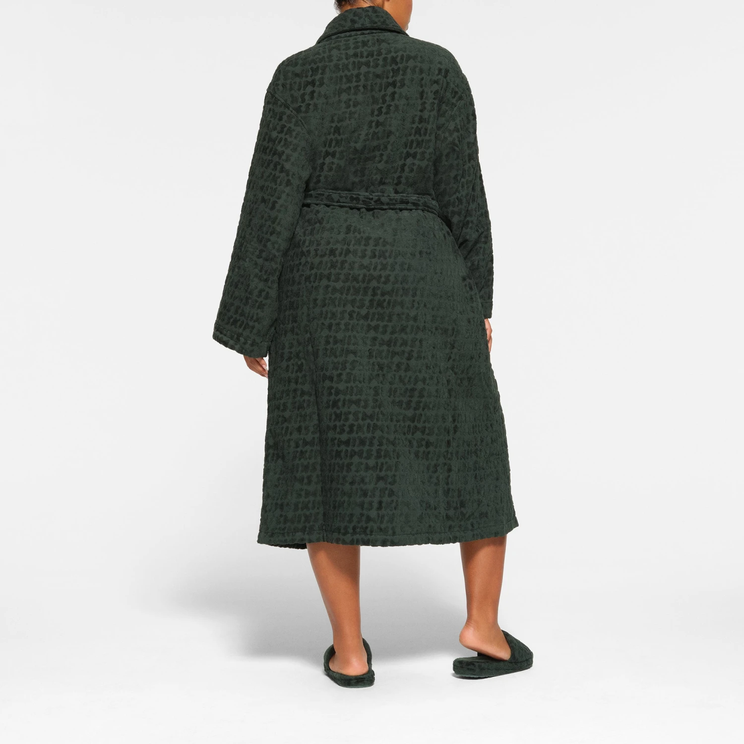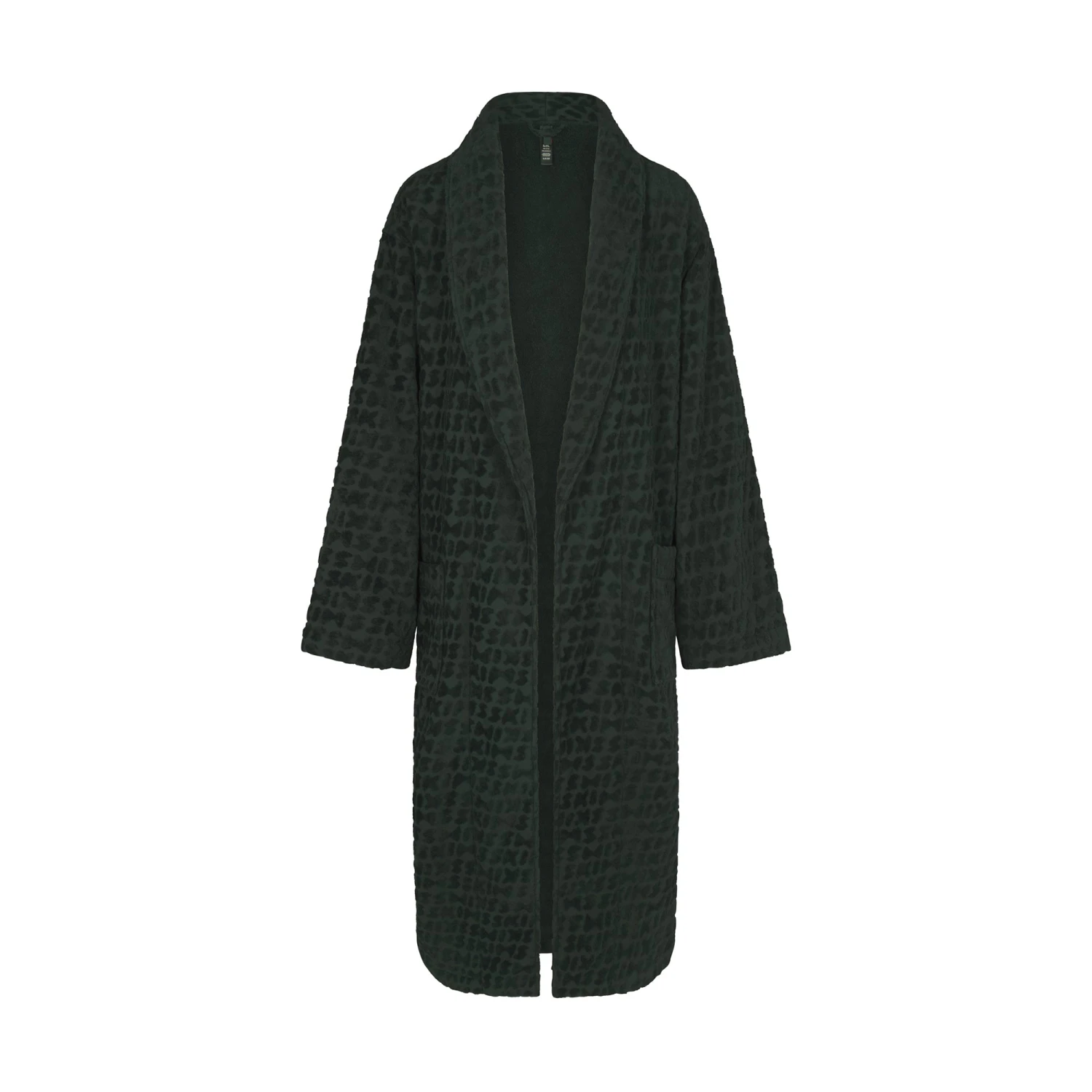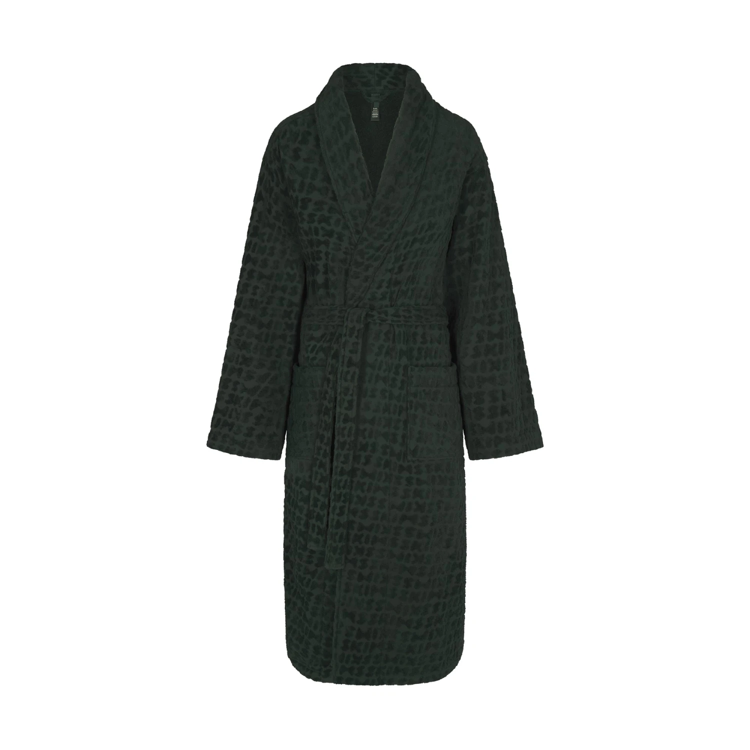 with all-over SKIMS logo details will have you lounging in ultimate luxury. Features two front pockets, a tie with belt loops, and a loop at the back for easy hanging. Fits true to size.