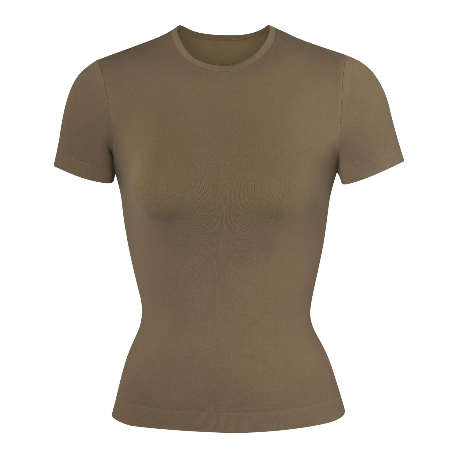 will be a staple in your wardrobe. This crew neck short sleeve style features a body-hugging fit that makes it the perfect
