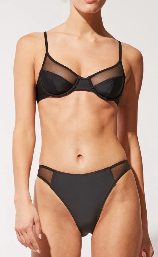 Feel confident in The Emily bikini bottom. The solid black body features mesh, hip hugging side paneling, offering a subtle sexy look to a classic medium coverage bottom. Pair it with the matching Top and Logan Pant in Marshmallow to complete your look.