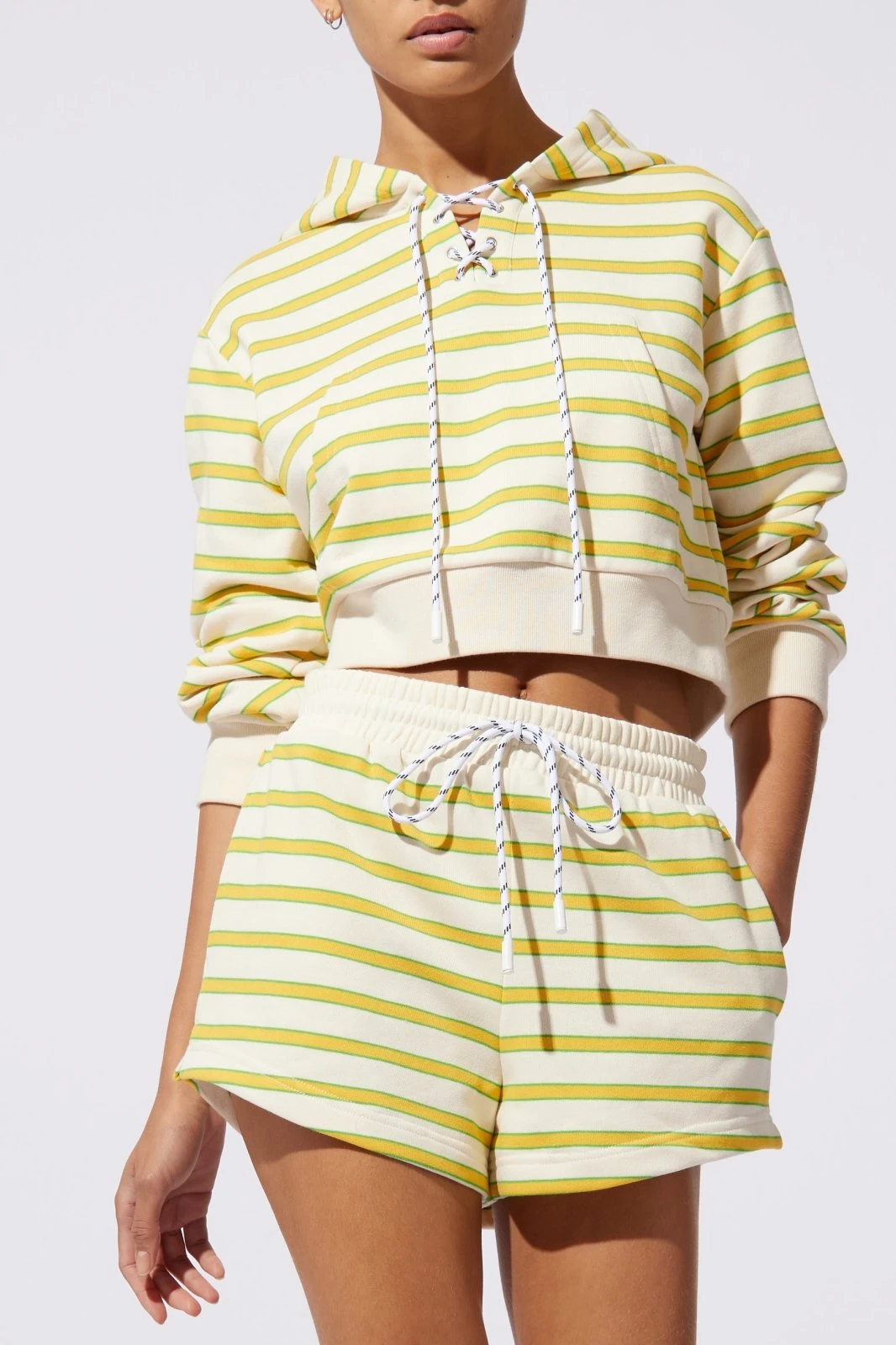 Comfy and cool, this striped cropped hoodie is made for everyday. Pair with the Jolie Short.