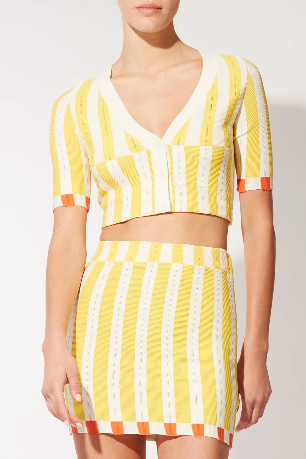 Dress up or down, the Leigh Cardigan is an effortless essential. Featured in a buttery yellow stripe with contrasting orange hemlines. This v-neck knit can be worn open or closed. Pair this pull-on skirt with the Ronnie Skirt for a day to night co-ord set.