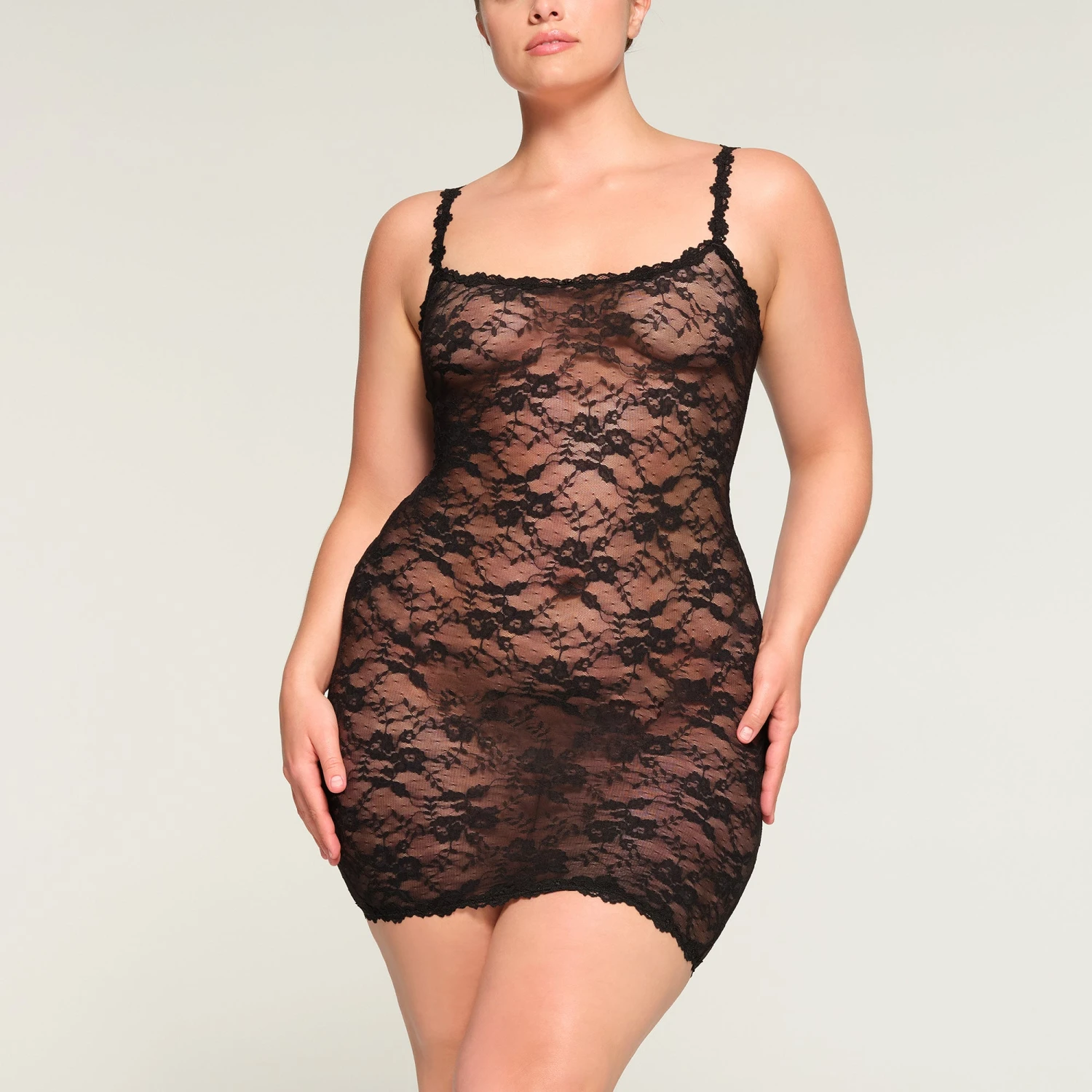 serves your curves with its fitted all-over sheer stretch lace fabric and romantic lace trim details. Features adjustable back straps, a mini length, and a rosette detail at the center front. Fits true to size.