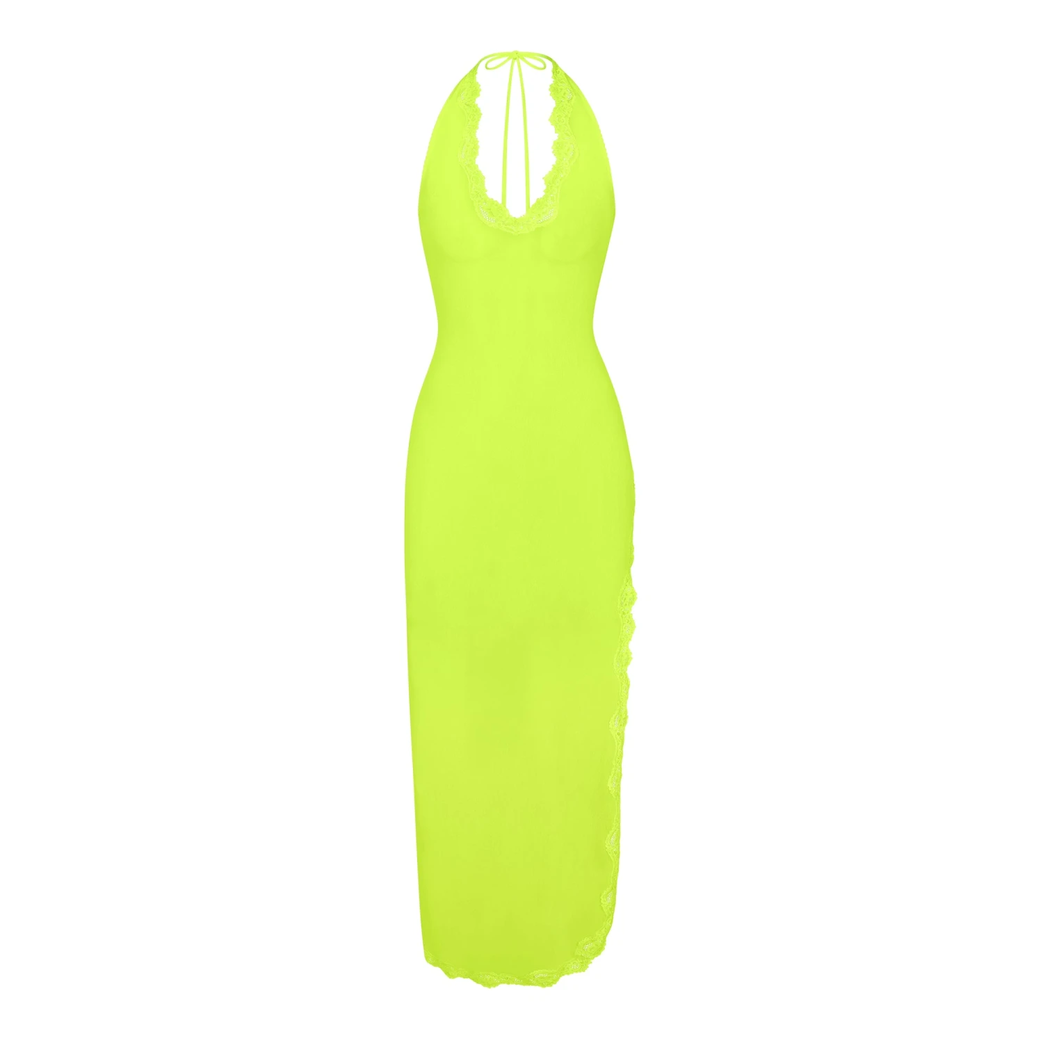 with sweet lace details and a sexy high-side slit. Features halter back ties, an open low back, and single layered mesh fabric. Fits true to size.